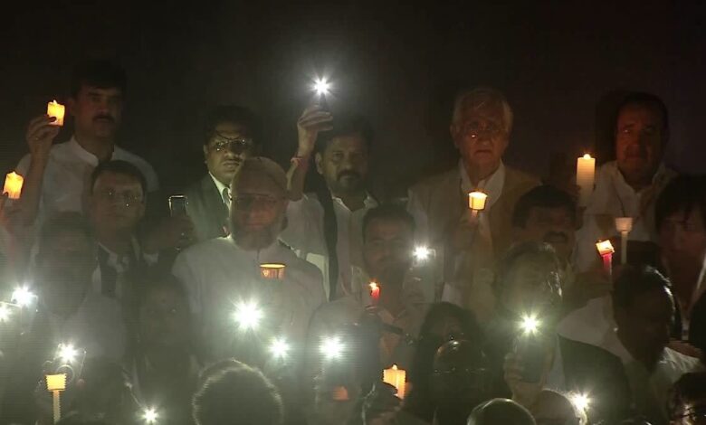 तेलंगाना के मुख्यमंत्री रेवंत रेड्डी ने पहलगाम आतंकवादी हमले के विरोध में हैदराबाद में एक मोमबत्ती रैली का नेतृत्व किया।