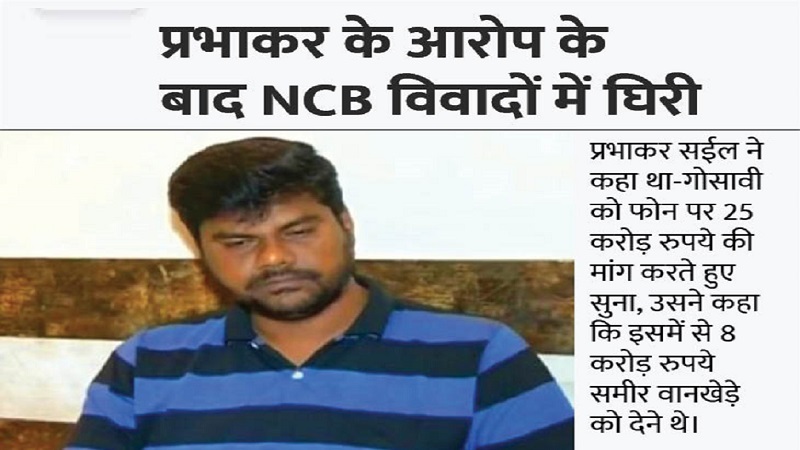 इस 25 करोड़ रुपए में 8 करोड़ रुपए NCB के जोनल डायरेक्टर समीर वानखेड़े को दिए जाने थे। प्रभाकर ने यह भी कहा था कि वह किसी के दबाव में आकर बयान नहीं दे रहा है और ना ही पैसों के लिए ऐसा कर रहा है। उसने महाराष्ट्र के किसी मंत्री से भी संबध होने से इनकार किया था।